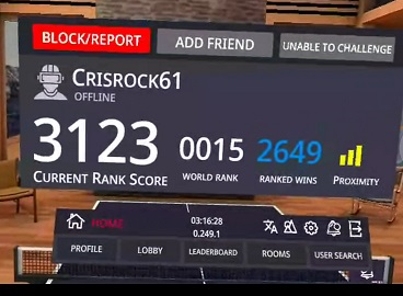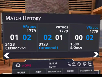 Я играю в VR под ником VRtuos. Обращаться можно по имени Денис. Рейтинг специально занижен, чтобы люди не боялись вызывать меня на бой и чтобы более рейтинговые игроки максимально упирались играя на счет. Не комфортно же проигрывать человеку с рейтингом сильно ниже своего )) Максимальное достижение это выигрыш у человека с 15-м местом в мировом рейтинге. С более сильными соперниками играть не доводилось.